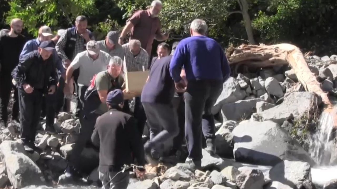 Köylülerin zorlu yolculuğu kameraya yansıdı. Görüntülerde, dere içinde omuzlarda taşının cenazeyi zaman zaman düşürme tehlikesiyle karşı karşıya kalındığı görüldü. Güçlükle köye ulaştırılan cenazenin, bugün toprağa verileceği öğrenildi. (DHA)