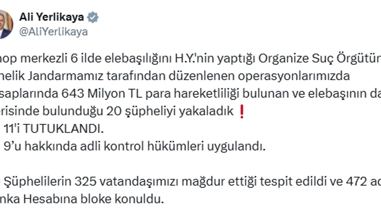 İçişleri Bakanı Ali Yerlikaya, jandarma tarafından düzenlenen suç örgütü operasyonunu sosyal medya hesabından paylaştı. Buna göre; Sinop merkezli 6 ilde elebaşılığını H.Y.'nin yaptığı organize suç örgütüne yönelik düzenlenen operasyonda hesaplarında 643 milyon TL para hareketliliği bulunan ve elebaşının da içerisinde bulunduğu 20 şüpheli yakalandı. Şüphelilerden 11'i çıkarıldığı hakimlikçe tutuklandı, 9'u hakkında adli kontrol hükümleri uygulandı. Şüphelilerin 325 vatandaşı mağdur ettiği tespit edildi ve 472 banka hesabına bloke konuldu.