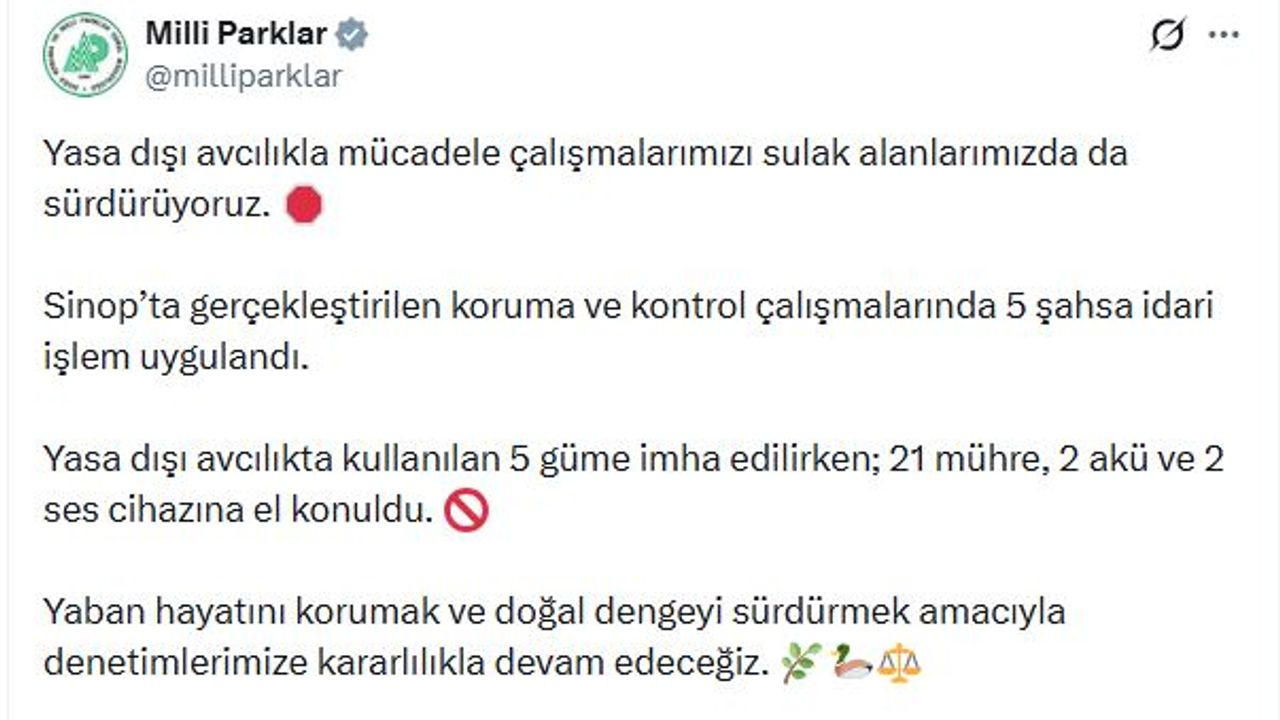 DKMP'nin sanal medya hesabından yapılan açıklamada, 'Yasa dışı avcılıkla mücadele çalışmalarımızı sulak alanlarımızda da sürdürüyoruz. Sinop'ta gerçekleştirilen koruma ve kontrol çalışmalarında 5 şahsa idari işlem uygulandı. Yasa dışı avcılıkta kullanılan 5 güme imha edilirken, 21 mühre, 2 akü ve 2 ses cihazına el konuldu. Yaban hayatını korumak ve doğal dengeyi sürdürmek amacıyla denetimlerimize kararlılıkla devam edeceğiz' denildi. (DHA)