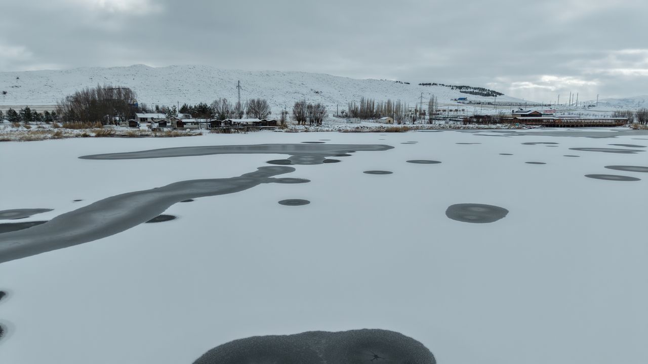 Sivas'ta hafta sonu aralıklarla etkili olan kar yağışı, yerini soğuk hava dalgasına bıraktı. Kentte sabah saatlerinde hava sıcaklığı sıfırın altında 8 derece olarak ölçüldü. Hafik ilçesi yakınında bulunan ve yaklaşık 1 kilometrekare alana sahip olan Hafik Gölü'nün yüzeyi de soğuk havanın etkisiyle kısmen buzla kaplandı. Her yıl havaların soğuması ile donmaya başlayan ve yılın 2-3 ayını buzlu yüzeyi ile geçiren göl, dron ile görüntülendi. Derinliği yer yer 2 ile 6 metreye kadar uzanan gölün donan yüzeyinde çatlaklar drona yansıdı. Öte yandan il genelinde kar yağışı sonrası köy ve mezralardan oluşan 33 yerleşim yeri yolu, ulaşıma kapalı bulunuyor. Özel İdare Müdürlüğü ekipleri, kapalı yolları açmak için çalışmalarını sürdürüyor. (DHA)