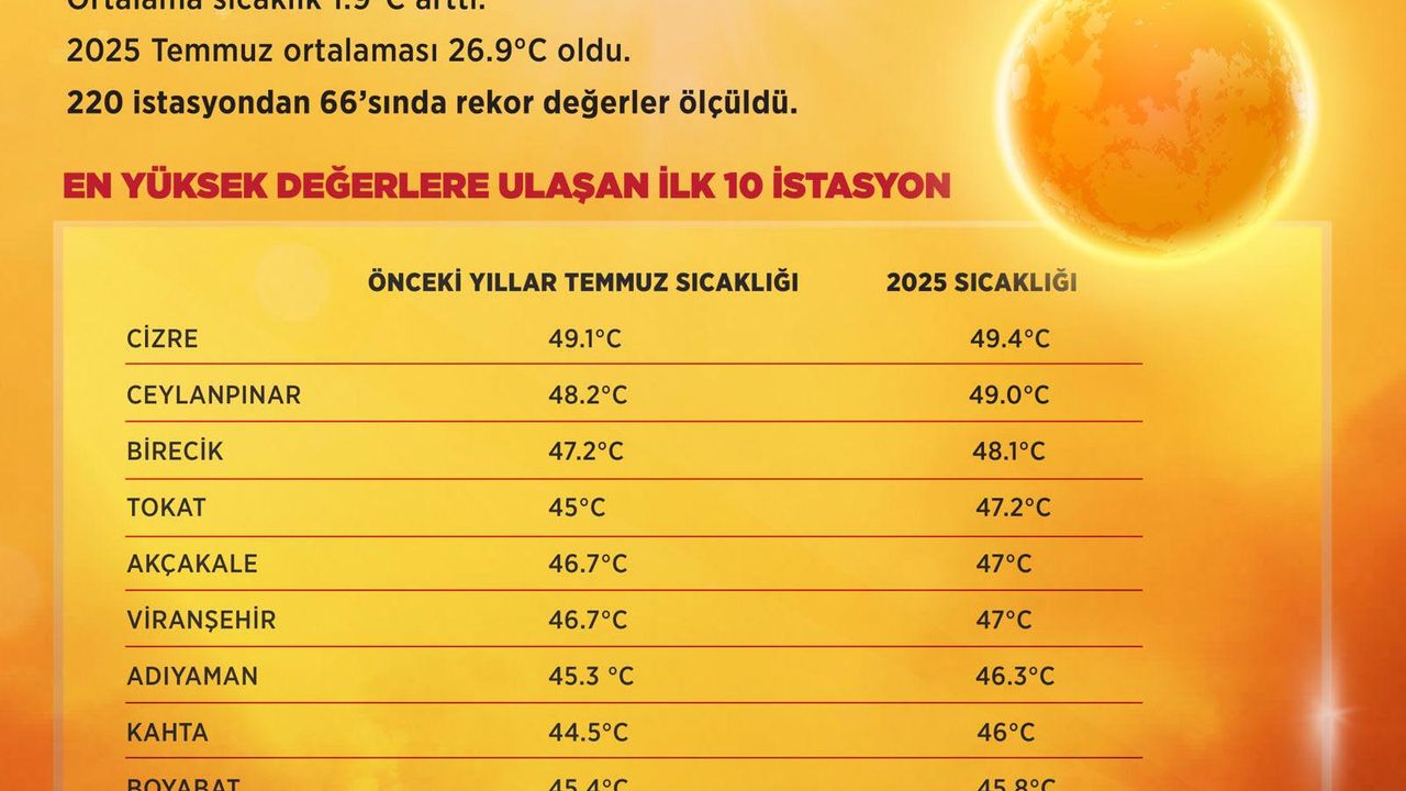 Türkiye’de iklim değerlendirilmesinde kullanılan 220 istasyondan 66’sında temmuz ayında rekor sıcaklık değerleri ölçüldü. Sıcaklık rekorlarının kaydedildiği ilk 10 istasyon arasında ilk sırada Cizre yer aldı. Ortalama temmuz sıcaklığı 49,1 derece olan ilçede bu yıl bu değer 49,4 dereceye yükseldi. Cizre’den sonra sırasıyla sıcaklık rekorları kırılan istasyonlar şöyle: