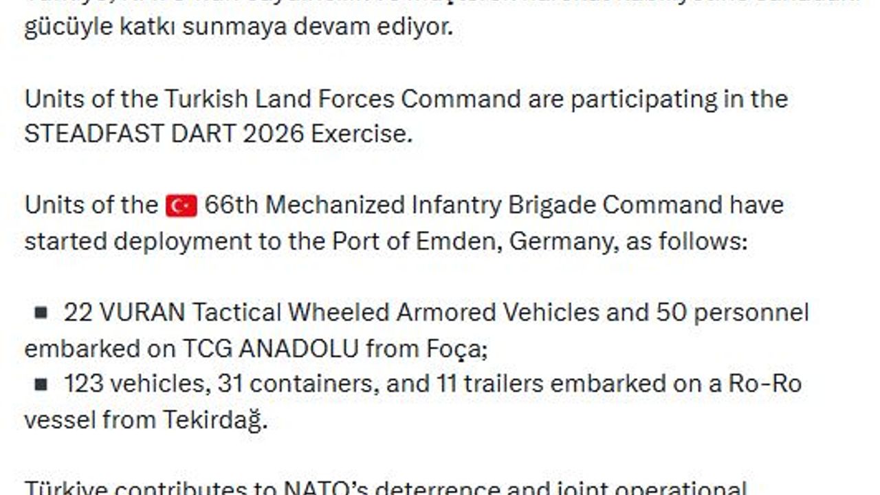 Milli Savunma Bakanlığı'nın sanal medya hesabından yapılan açıklamada, 'Kara Kuvvetleri Komutanlığı unsurları, STEADFAST DART 2026 Tatbikatı'na katılıyor. Bu kapsamda 66'ncı Mekanize Piyade Tugay Komutanlığı'na ait 22 adet VURAN ve 50 personel TCG Anadolu ile Foça'dan, 123 araç, 31 konteyner ve 11 römork ise sivil Ro-Ro gemisiyle Tekirdağ'dan Emden/Almanya Limanı'na intikale başladı. Türkiye, NATO'nun caydırıcılık ve müşterek harekat kabiliyetine sahadaki gücüyle katkı sunmaya devam ediyor' denildi. (DHA)