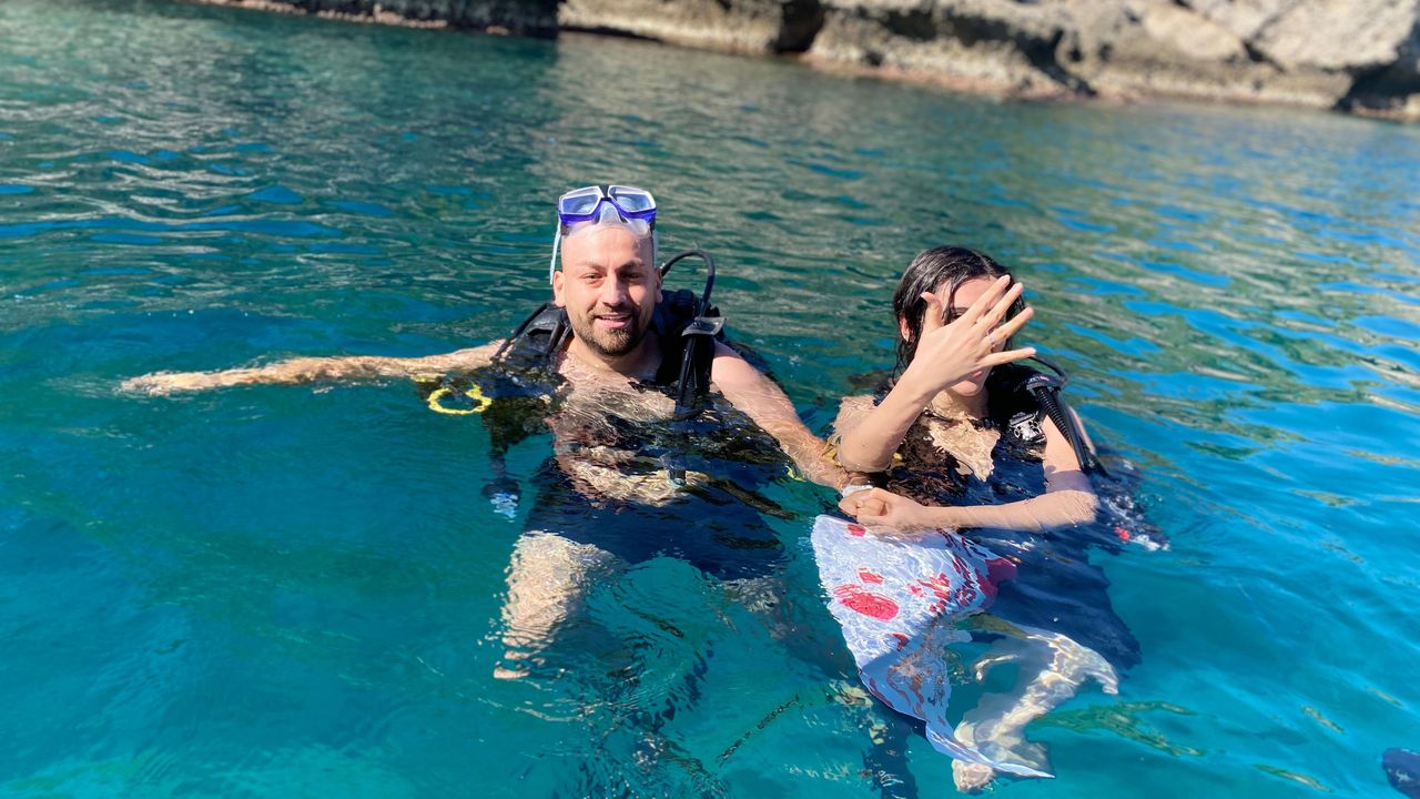 Kentte restoran müdürü olarak görev yapan Muhammet Akbıyık, uzun süre birlikte olduğu Ezgi Uysal'a sürpriz evlilik teklifi planladı. Çift, Okurcalar Mahallesi'ndeki dalış okulunun eğitmenleri eşliğinde denize tüplü dalış yaptı. Bu sırada Akbıyık, önceden hazırladığı 'Benimle evlenir misin' yazısının yer aldığı kağıdı açıp Uysal'a evlilik tekli yaptı. Teklifinin kabul edilmesinin ardından Akbıyık, Uysal'a yüzük taktı. Çiftin mutlu anları su altı kamerasıyla kaydedildi. (DHA)