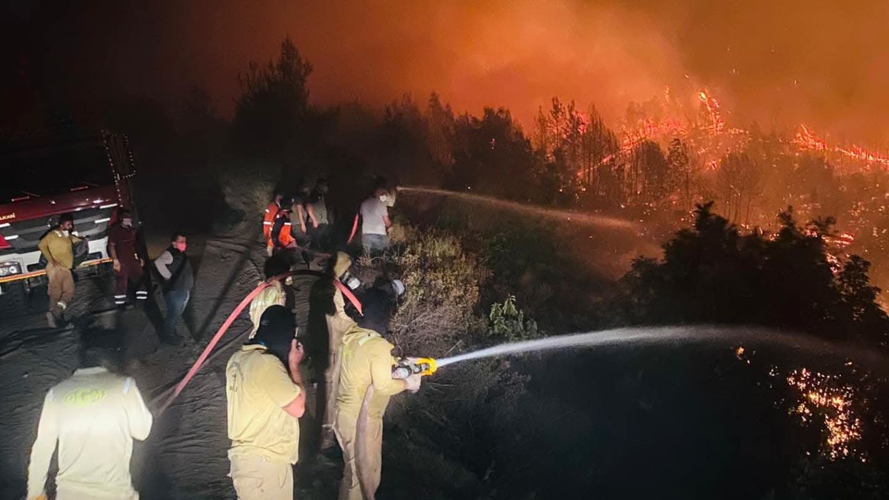 Alican GÜMÜŞ/ HATAY, (DHA)- SURİYE'nin Lazkiye kırsalında bir haftadır devam eden orman yangınında alevler bir kez daha Türkiye sınırına yaklaştı. Hatay'dan ekipler, Suriye'nin Türkiye sınırında yangına müdahale ediyor.