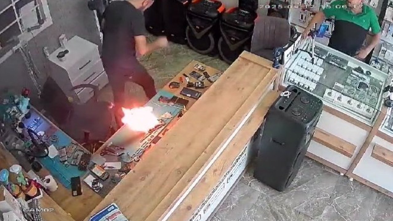 Erkan ALTUNTAŞ/AKSARAY, (DHA)- AKSARAY’da arızalı telefonun bataryası tamir için getirildiği iş yerinde patlayıp, alev aldı. O anlar güvenlik kamerasına yansıdı.