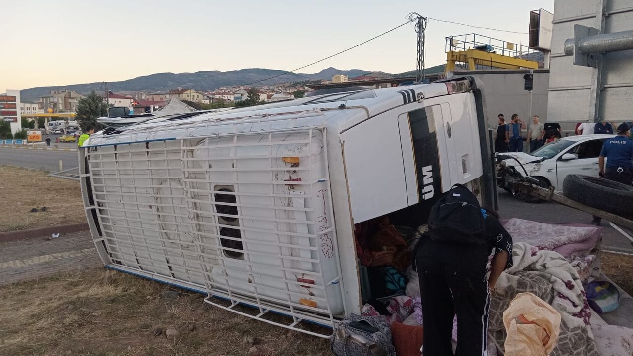 Uğur YİĞİT- Oğuzhan ÇİFCİ/SİVAS, (DHA)- SİVAS'ın Suşehri ilçesinde otomobille çarpıştıktan sonra devrilen minibüsteki 15 tarım işçisi yaralandı.