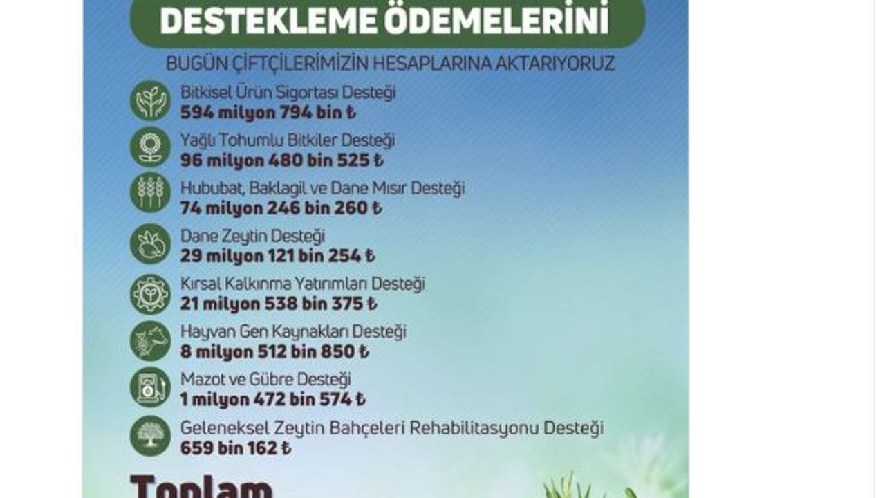 Gizem CENGİL/ANKARA, (DHA)- TARIM ve Orman Bakanlığı, 826 milyon 825 bin TL tarımsal destekleme ödemesinin bugün çiftçilerin hesaplarına aktarılacağını açıkladı.