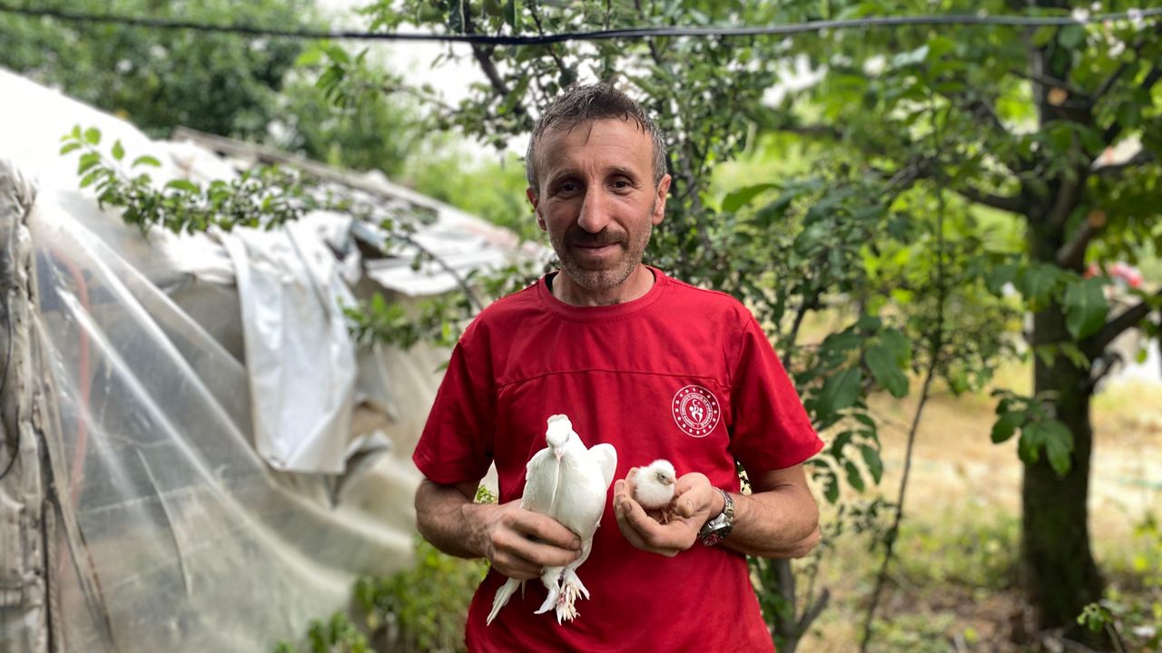 Selda FIRAT/GÜMÜŞHANE, (DHA)- GÜMÜŞHANE'de çiftçi Erdinç Şekerli, kümeste kuluçka sürecinde kendi yumurtalarını çatlatamayan güvercinin altına tavuk yumurtası koydu. 21 gün sonra yumurta çatlarken, güvercin çıkan civcivi sahiplendi. Civcive ‘Pamuk' ismini veren Şekerli, “Anneliğin çok kutsal olduğunu burada da görmüş olduk” dedi.