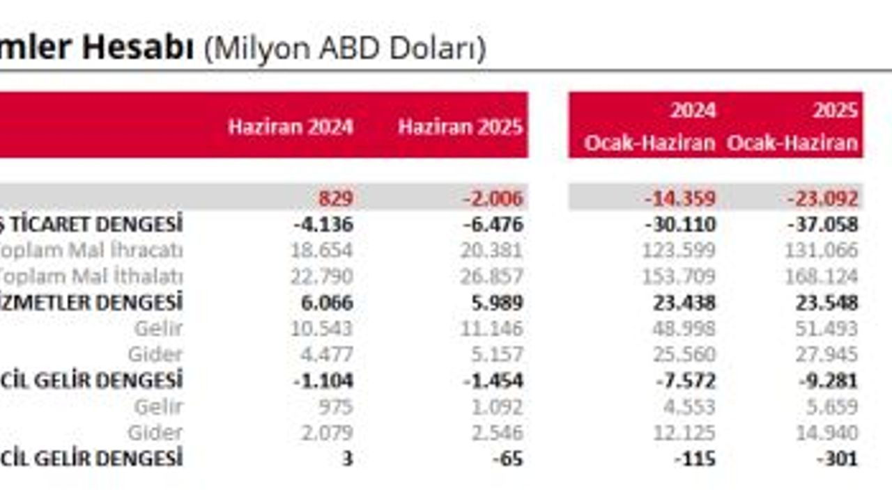 TCMB, Haziran 2025 dönemine ilişkin ödemeler dengesi istatistiklerini açıkladı. Buna göre; haziran ayında cari işlemler hesabı 2 milyar 6 milyon dolar açık kaydetti. Altın ve enerji hariç cari işlemler hesabı ise 2 milyar 579 milyon dolar fazla verdi. Ödemeler dengesi tanımlı dış ticaret açığı 6 milyar 476 milyon dolar olarak gerçekleşti. Yıllıklandırılmış verilere göre, haziran ayında cari açık yaklaşık 18,9 milyar dolar olurken, ödemeler dengesi tanımlı dış ticaret dengesi de 63,3 milyar dolar açık verdi. Aynı dönemde hizmetler dengesi 62,1 milyar dolar fazla verirken, birincil ve ikincil gelir dengesi sırasıyla 17,6 milyar dolar ve 0,1 milyar dolar açık verdi. Hizmetler dengesi kaynaklı net girişler bu ay 5 milyar 989 milyon dolar seviyesinde gerçekleşirken, bu kalem altında taşımacılık hizmetleri ve seyahat kaleminden kaynaklanan net gelirler sırasıyla 1 milyar 875 milyon dolar ve 5 milyar 15 milyon dolar oldu.