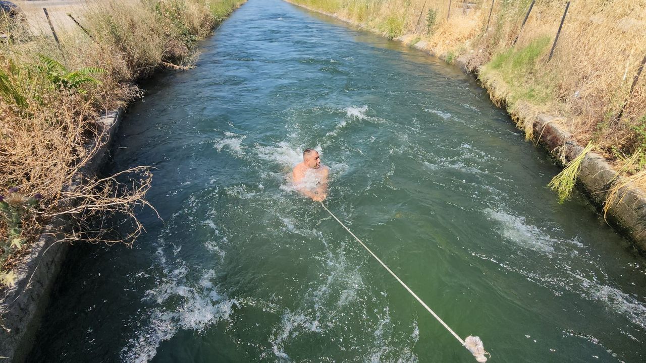 İlçede sıcak havadan bunalan vatandaşlar, serinlemek için Fevzidede Mahallesi’ndeki sulama kanalına girdi. Aralarında çocukların da olduğu 7 kişi, köprü üzerinden kanala atlayıp, can güvenliklerini tehlikeye atarak yüzdü. Suya girenler, köprüye bağladıkları halata tutunarak da kendilerince tedbir aldı. Vatandaşlar, denize ve havuza girme imkanlarının olmadığını söyledi. (DHA)
