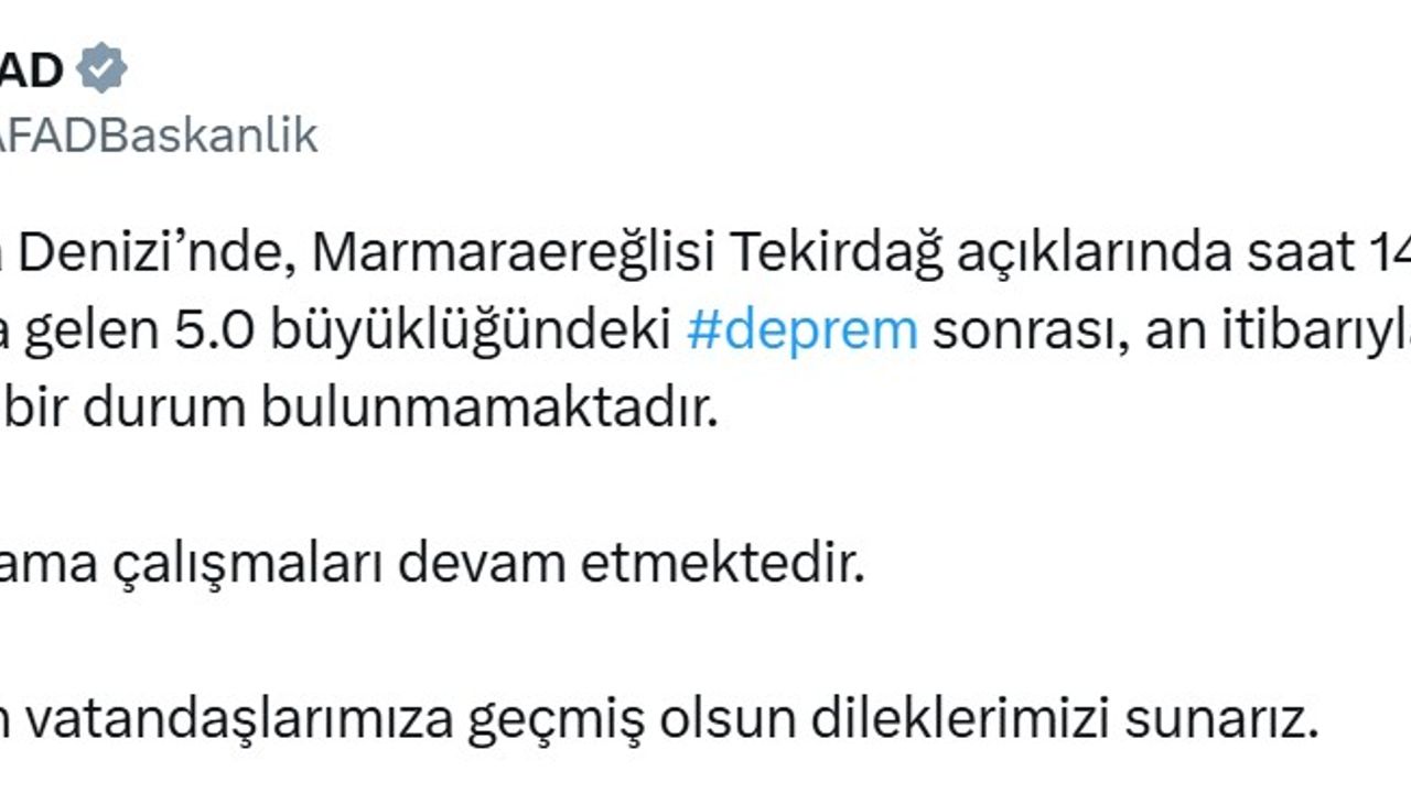 Afet ve Acil Durum Yönetimi Başkanlığı'ndan (AFAD) yapılan açıklamada, "Marmara Denizi’nde, Marmaraereğlisi Tekirdağ açıklarında saat 14.55’te meydana gelen 5 büyüklüğündeki deprem sonrası, an itibarıyla, olumsuz bir durum bulunmamaktadır. Saha tarama çalışmaları devam etmektedir. Etkilenen vatandaşlarımıza geçmiş olsun dileklerimizi sunarız" dedi. (DHA)