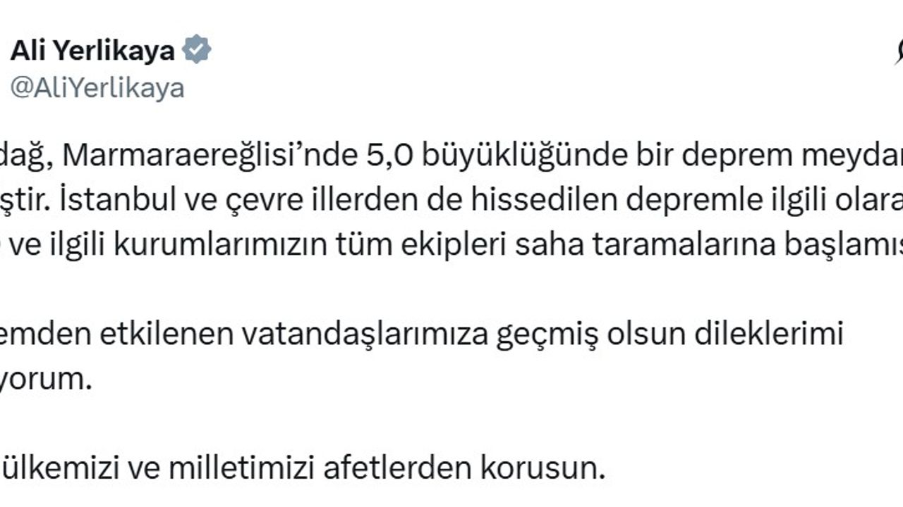 İçişleri Bakanı Ali Yerlikaya, sosyal medya hesabından yaptığı açıklamada, "Tekirdağ, Marmaraereğlisi'nde 5 büyüklüğünde bir deprem meydana gelmiştir. İstanbul ve çevre illerden de hissedilen depremle ilgili olarak, AFAD ve ilgili kurumlarımızın tüm ekipleri saha taramalarına başlamıştır. Depremden etkilenen vatandaşlarımıza geçmiş olsun dileklerimi sunuyorum. Allah ülkemizi ve milletimizi afetlerden korusun" dedi. (DHA)