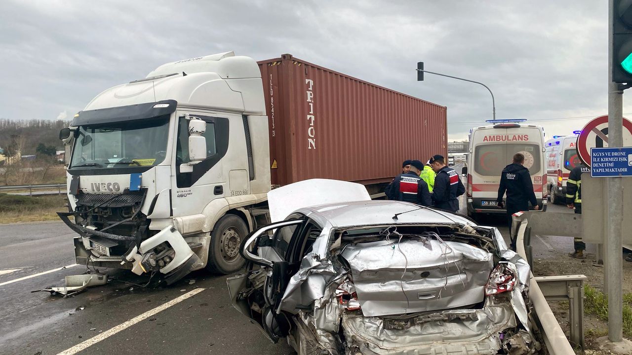 Kaza, saat 10.30 sıralarında Çerkezköy-Çorlu D100 kara yolunun Veliköy mevkisi 2'nci ışıklı kavşakta meydana geldi. Çorlu'dan Çerkezköy yönüne giden S.B. idaresindeki 34 EDD 866 plakalı TIR, yağışlı hava nedeniyle kayganlaşan yolda sürücüsünün kontrolünü kaybetmesiyle ışıklarda bekleyen B.A. idaresindeki 34 FK 6169 otomobile arkadan çarptı. Yol kenarındaki bariyerlere savrulup hurdaya dönen otomobildeki 3 kişi yaralandı. İhbar üzerine kaza yerine sağlık, itfaiye, jandarma ve polis ekipleri sevk edildi. Araçta sıkışan 3 yaralı itfaiye ekipleri tarafından kurtarılıp, sağlık ekiplerine teslim edildi. Yaralılar ilk müdahalelerinin ardından ambulanslarla Çerkezköy Devlet Hastanesine kaldırıldı. Kaza nedeniyle yolda trafik, bir süre tek şeritten sağlandı.