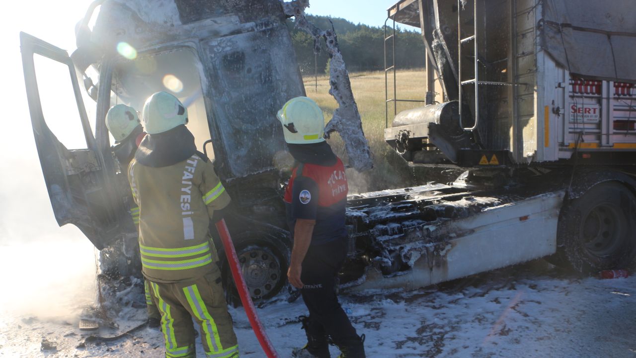 Fatih YILMAZ/ TOKAT, (DHA)- TOKAT- Sivas karayolu üzerinde seyir halindeki bir TIR alev alev yanmaya başladı. İtfaiye ekiplerinin müdahalesiyle yangın söndürülürken TIR kullanılmaz hale geldi.