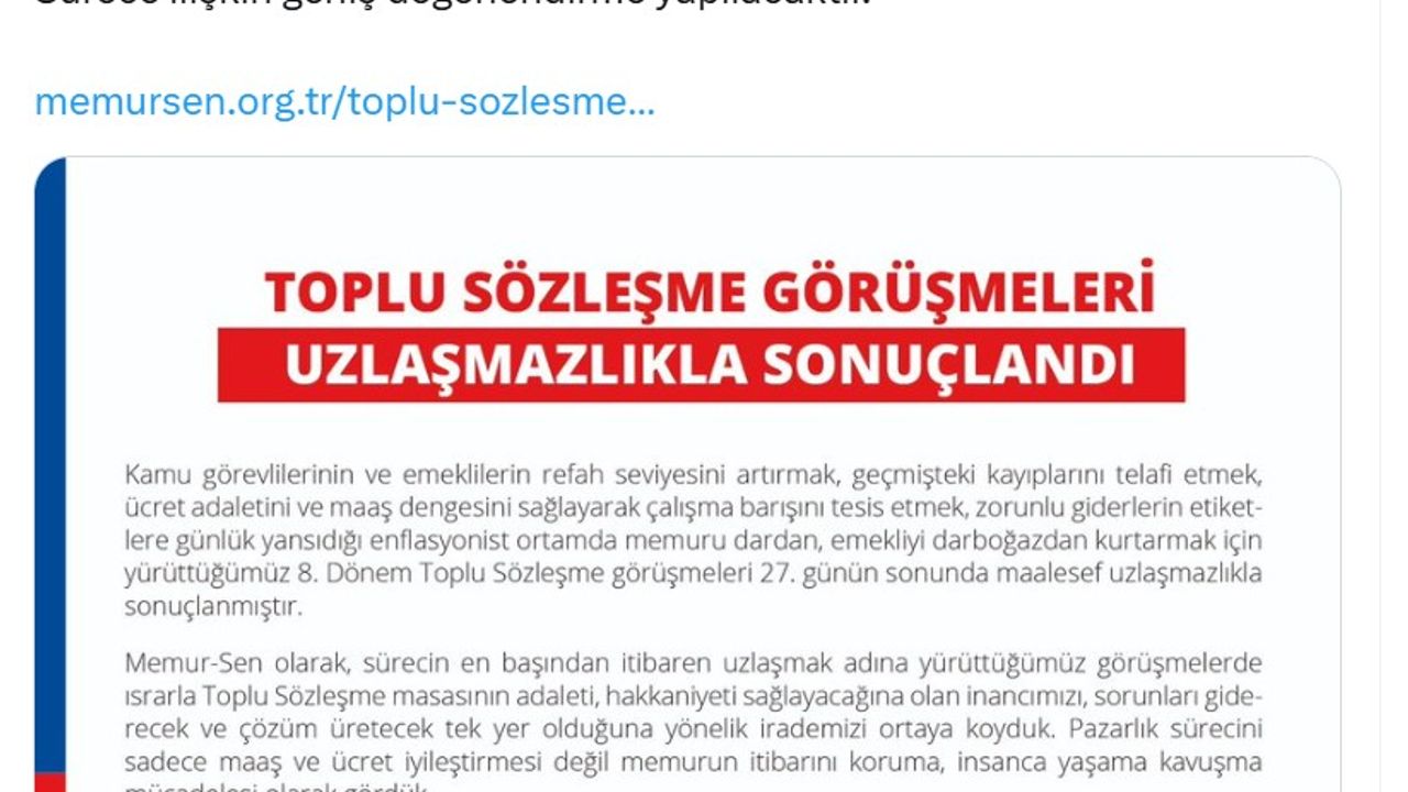 Memur-Sen'in sosyal medya hesabından yapılan açıklamada, "Kamu görevlilerinin ve emeklilerin refah seviyesini artırmak, geçmişteki kayıplarını telafi etmek, ücret adaletini ve maaş dengesini sağlayarak çalışma barışını tesis etmek, zorunlu giderlerin etiketlere günlük yansıdığı enflasyonist ortamda memuru dardan, emekliyi darboğazdan kurtarmak için yürüttüğümüz 8'inci Dönem Toplu Sözleşme görüşmeleri, 27'nci günün sonunda maalesef uzlaşmazlıkla sonuçlanmıştır" denildi.