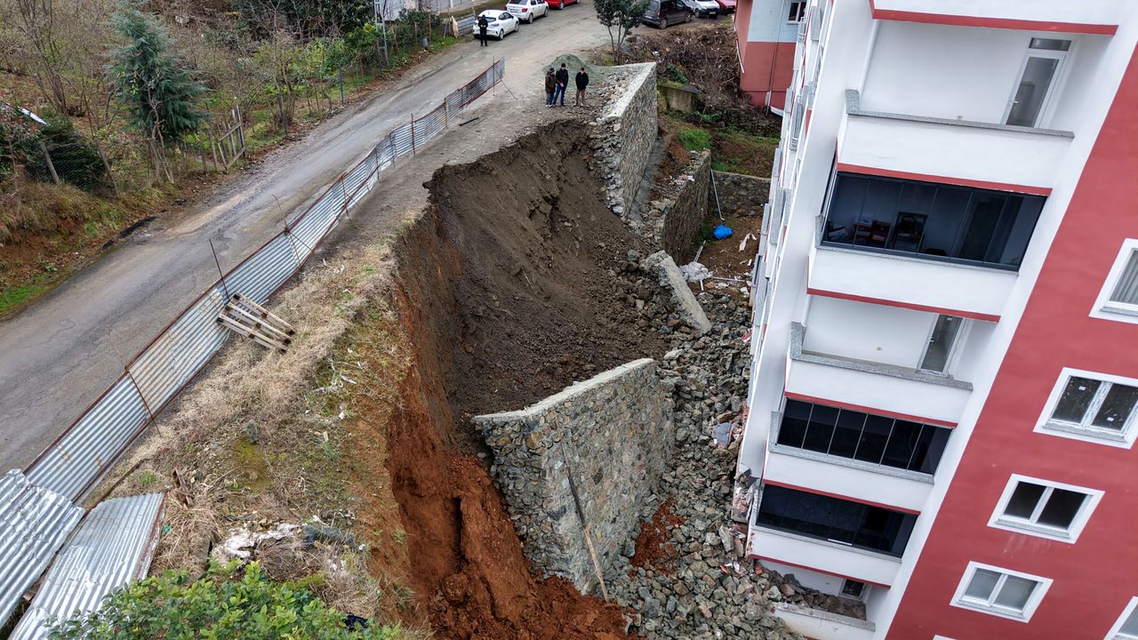 Selçuk BAŞAR-Efnan DEMİREREN/TRABZON, (DHA)- TRABZON'un Yomra ilçesinde çöken istinat duvarı nedeniyle binanın 1 ve 2'nci katındaki 2 dairede hasar oluştu. Hasar gören bina dron kamerasıyla görüntülendi.
