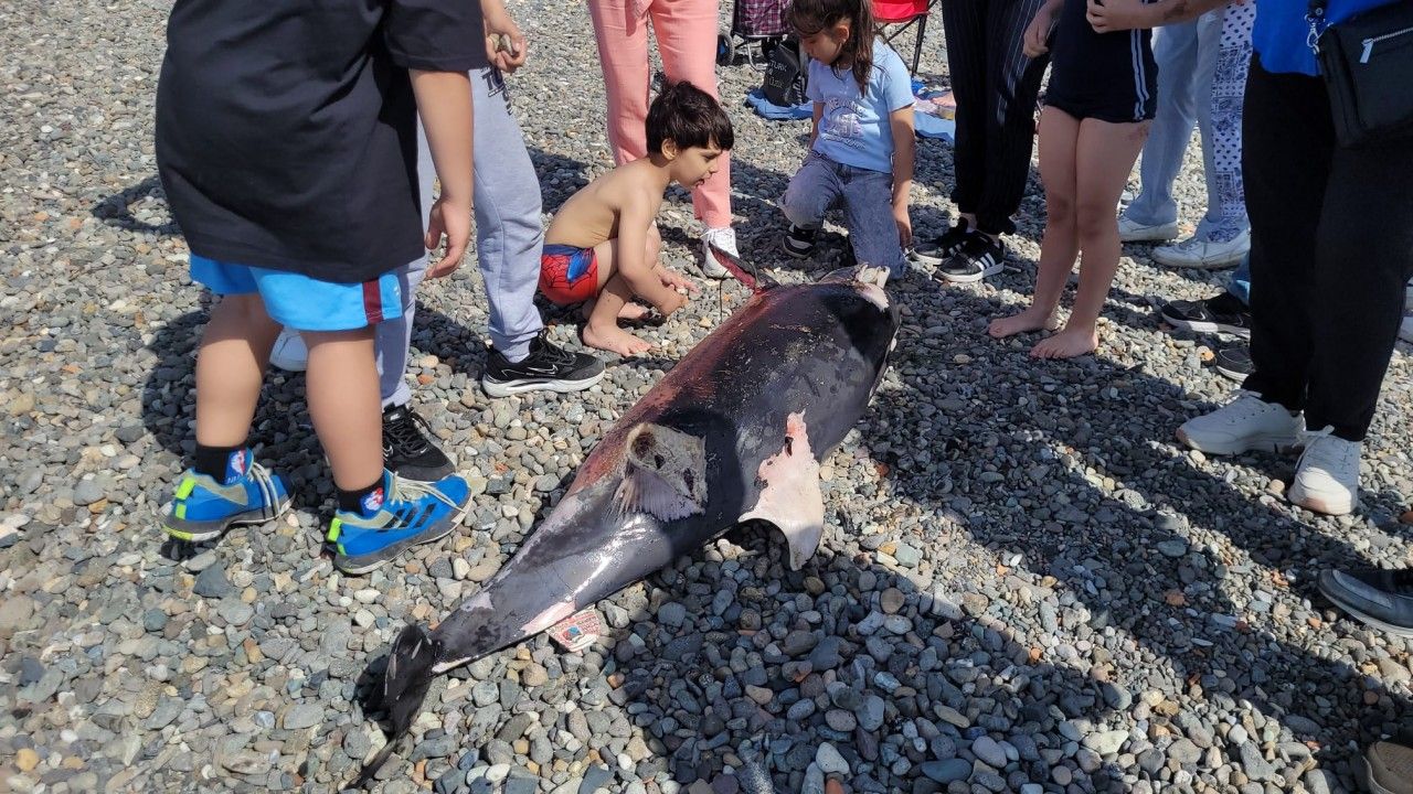 Selçuk BAŞAR-Efnan DEMİREREN/TRABZON, (DHA)- TRABZON'un Ortahisar ilçesinde ölü yunus, sahile vurdu. Sahilde kumla oynayan çocuklar, ölü yunusu meraklı gözlerle izledi.