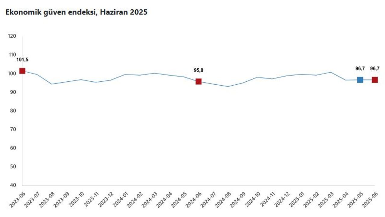 TÜİK, Haziran 2025 dönemine ilişkin ekonomik güven endeksi verilerini açıkladı. Buna göre; ekonomik güven endeksi haziran ayında bir önceki aya göre yüzde 0,1 oranında artarak 96,71 değerini aldı. Bir önceki aya göre haziran ayında tüketici güven endeksi yüzde 0,3 oranında artarak 85,1 değerini, reel kesim (imalat sanayi) güven endeksi yüzde 0,2 oranında azalarak 98,4 değerini, hizmet sektörü güven endeksi yüzde 0,4 oranında artarak 110,9 değerini, perakende ticaret sektörü güven endeksi yüzde 2,5 oranında azalarak 108,5 değerini, inşaat sektörü güven endeksi yüzde 1,7 oranında azalarak 86,9 değerini aldı. (DHA)