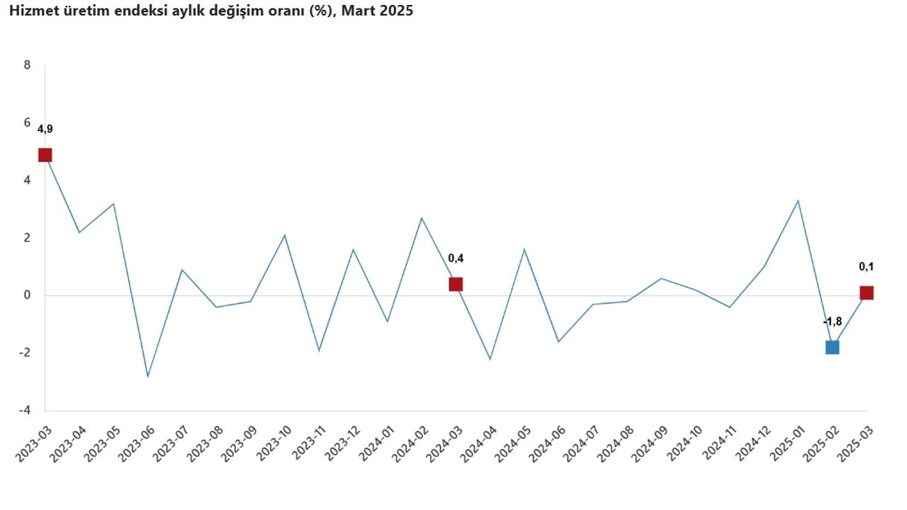 TÜİK, Mart 2025 dönemine ilişkin hizmet üretim endeksi verilerini açıkladı. Buna göre; hizmet üretimi bir önceki yılın aynı ayına göre yüzde 0,4 arttı. Aynı ayda ulaştırma ve depolama hizmetleri yüzde 1,3 azaldı, konaklama ve yiyecek hizmetleri yüzde 2,5 azaldı, bilgi ve iletişim hizmetleri yüzde 6,3 arttı, gayrimenkul hizmetleri yüzde 3,3 azaldı, mesleki, bilimsel ve teknik hizmetler yüzde 3,7 arttı, idari ve destek hizmetleri ise yüzde 2,8 arttı.
