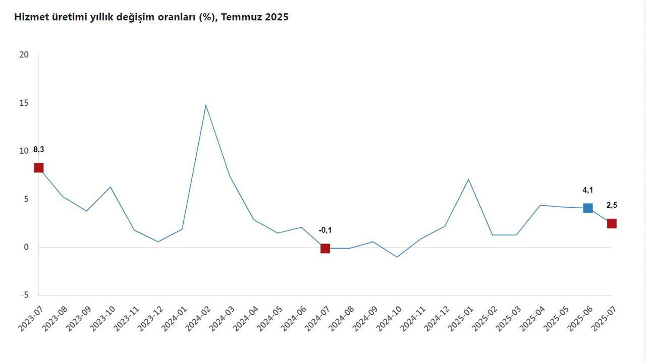 TÜİK, Temmuz 2025 dönemine ilişkin hizmet üretim endeksi verilerini açıkladı. Buna göre; hizmet üretimi temmuz ayında bir önceki yılın aynı ayına göre yüzde 2,5 arttı. Aynı ayda ulaştırma ve depolama hizmetleri yüzde 2 azalırken, konaklama ve yiyecek hizmetleri yüzde 2,6, bilgi ve iletişim hizmetleri yüzde 14,6, gayrimenkul hizmetleri yüzde 15,7, mesleki, bilimsel ve teknik hizmetler yüzde 6,4, idari ve destek hizmetleri yüzde 1,3 arttı.