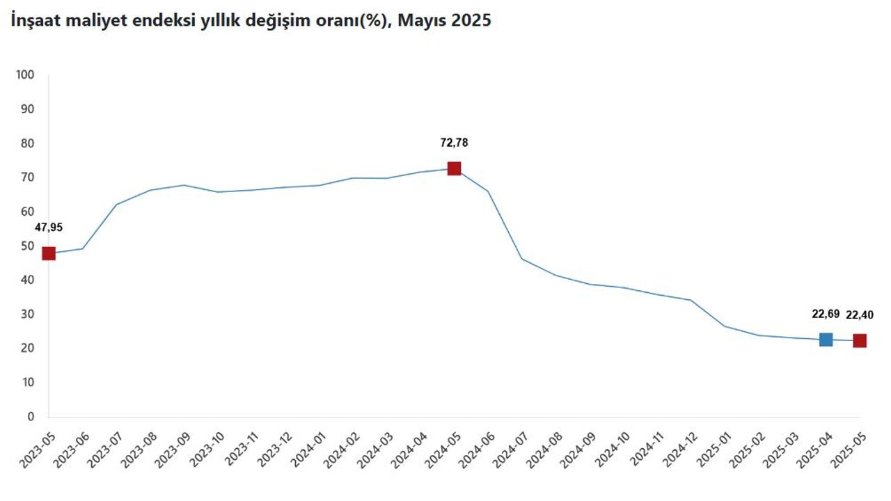 TÜİK, Mayıs 2025 dönemine ilişkin inşaat maliyet endeksi verilerini açıkladı. Buna göre; inşaat maliyet endeksi, bir önceki aya göre yüzde 0,88, bir önceki yılın aynı ayına göre yüzde 22,40 arttı. Bir önceki aya göre malzeme endeksi yüzde 1,09, işçilik endeksi yüzde 0,52 arttı. Bir önceki yılın aynı ayına göre malzeme endeksi yüzde 17,81, işçilik endeksi yüzde 31,39 arttı.