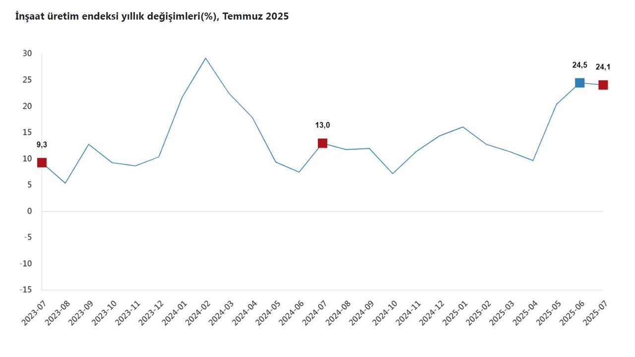 TÜİK, Temmuz 2025 dönemine ilişkin inşaat üretim endeksi verilerini açıkladı. Buna göre; inşaat üretimi bir önceki yılın aynı ayına göre yüzde 24,1 arttı. İnşaatın alt sektörleri incelendiğinde, bina inşaatı sektörü endeksi bir önceki yılın aynı ayına göre yüzde 26,2, bina dışı yapıların inşaatı sektörü endeksi yüzde 16,4 ve özel inşaat faaliyetleri sektörü endeksi yüzde 22,6 arttı. İnşaat üretimi, bir önceki aya göre ise yüzde 1,9 arttı. İnşaatın alt sektörleri incelendiğinde, bina inşaatı sektörü endeksi bir önceki aya göre yüzde 2,6, bina dışı yapıların inşaatı sektörü endeksi yüzde 0,3 ve özel inşaat faaliyetleri sektörü endeksi yüzde 0,2 arttı.