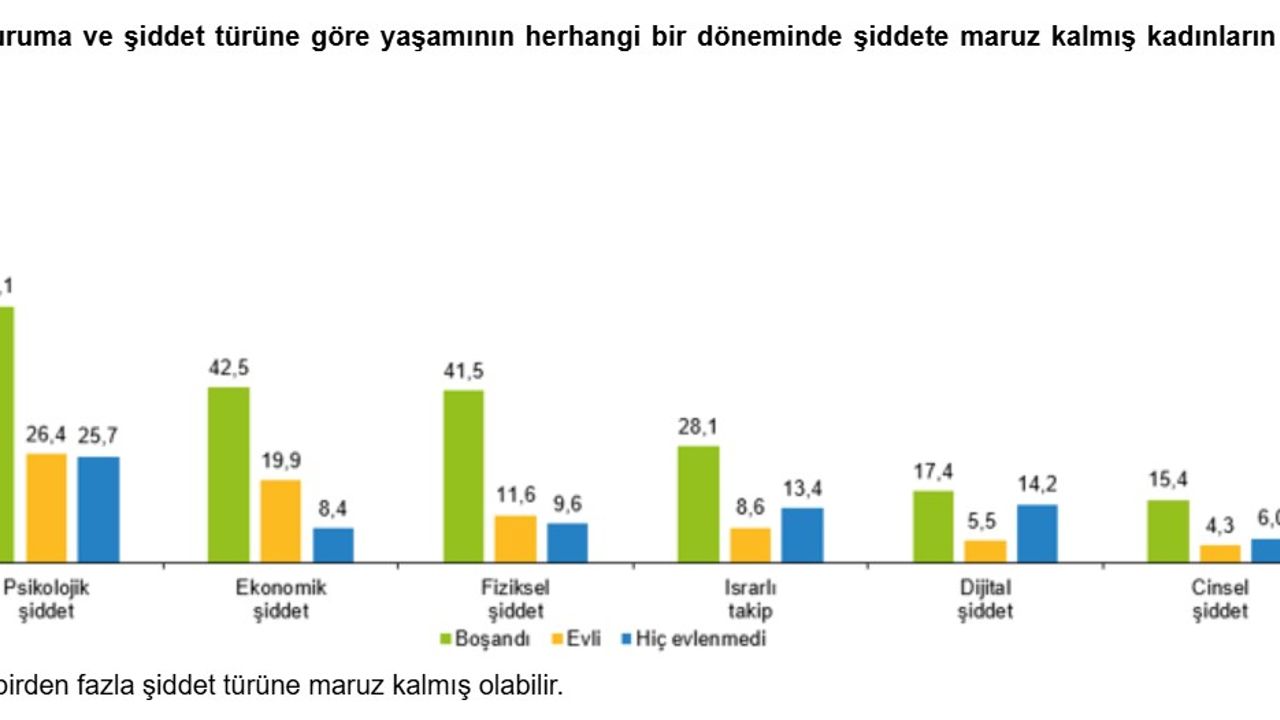 Buna göre; yaşamının herhangi bir döneminde kadınların yüzde 28,2'si psikolojik, yüzde 18,3'ü ekonomik, yüzde 12,8'i ise fiziksel şiddete uğradı. Tüm şiddet türleri yaş grubuna göre incelendiğinde, yaşamının herhangi bir döneminde fiziksel şiddete en yüksek oranda 35-44 yaş grubundaki kadınlar maruz kaldı. Bu yaş grubunu sırasıyla yüzde 14,3 ile 45-59 yaş grubundaki kadınlar, yüzde 11,9 ile 25-34 yaş grubundaki kadınlar takip etti. Yaşamının herhangi bir döneminde maruz kalınan şiddet değerlendirildiğinde, boşanan kadınların yüzde 62,1'i psikolojik, yüzde 42,5'i ekonomik, yüzde 41,5'i ise fiziksel şiddete maruz kalırken; evli kadınların yüzde 26,4'ü psikolojik, yüzde 19,9'u ekonomik, yüzde 11,6'sı ise fiziksel şiddete maruz kaldı. Hiç evlenmeyen kadınların yüzde 25,7'si psikolojik şiddete, yüzde 14,2'si dijital şiddete, yüzde 13,4'ü ise ısrarlı takibe maruz kaldı. Yaşamının herhangi bir döneminde şiddete maruz kalmış kadınlar, şiddeti uygulayan kişilere göre incelendiğinde, dijital şiddette yabancı biri yüzde 62,3 ile ilk sıradayken, eş/eski eş/birlikte olduğu kişi yüzde 15,7 ile ikinci sırada yer aldı. Israrlı takipte ise ilk sırayı yüzde 39,6 ile yabancı biri alırken, ikinci sırayı yüzde 32,1 ile eş/eski eş/birlikte olduğu kişi aldı.