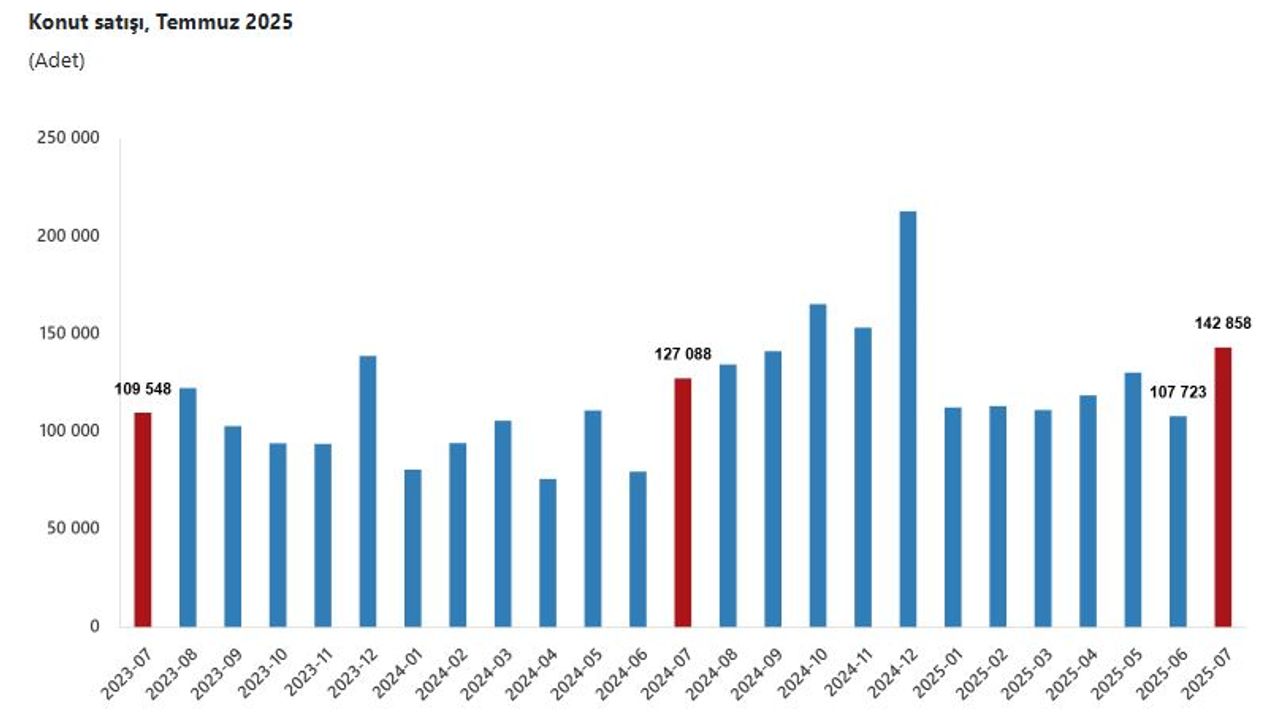 TÜİK, Temmuz 2025 dönemine ilişkin konut satış istatistiklerini açıkladı. Buna göre; Türkiye genelinde konut satışları temmuz ayında bir önceki yılın aynı ayına göre yüzde 12,4 oranında artarak 142 bin 858 oldu. Konut satış sayısının en fazla olduğu iller sırasıyla 23 bin 152 ile İstanbul, 12 bin 491 ile Ankara ve 7 bin 815 ile İzmir olurken, en az olduğu iller sırasıyla 58 ile Ardahan, 93 ile Bayburt ve 103 ile Hakkari olarak gerçekleşti. Konut satışları ocak-temmuz döneminde bir önceki yılın aynı dönemine göre yüzde 24,2 oranında artarak 834 bin 751 olarak gerçekleşti.