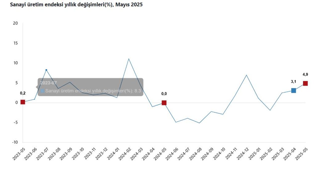 TÜİK, Mayıs 2025 dönemine ilişkin sanayi üretim endeksi verilerini açıkladı. Buna göre; sanayi üretimi bir önceki yılın aynı ayına göre yüzde 4,9 arttı. Sanayinin alt sektörleri incelendiğinde, madencilik ve taş ocakçılığı sektörü endeksi bir önceki yılın aynı ayına göre yüzde 10 arttı, imalat sanayi sektörü endeksi yüzde 4,6 arttı ve elektrik, gaz, buhar ve iklimlendirme üretimi ve dağıtımı sektörü endeksi yüzde 4,7 arttı.
