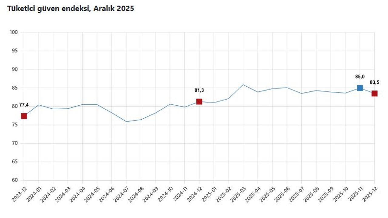 TÜİK, Aralık 2025 dönemine ilişkin tüketici güven endeksi verilerini açıkladı. Buna göre; tüketici güven endeksi bir önceki aya göre yüzde 1,8 oranında azalarak 83,5 oldu. Alt endekslerindeki değişim oranlarına bakıldığında; mevcut dönemde hanenin maddi durumu endeksi yüzde 2,4 azalarak 67,9, gelecek 12 aylık dönemde hanenin maddi durum beklentisi endeksi yüzde 0,6 azalarak 85,2, gelecek 12 aylık dönemde genel ekonomik durum beklentisi endeksi yüzde 1,8 azalarak 78,2, gelecek 12 aylık dönemde dayanıklı tüketim mallarına harcama yapma düşüncesi endeksi ise yüzde 2,3 azalarak 102,6 değerini aldı. (DHA)