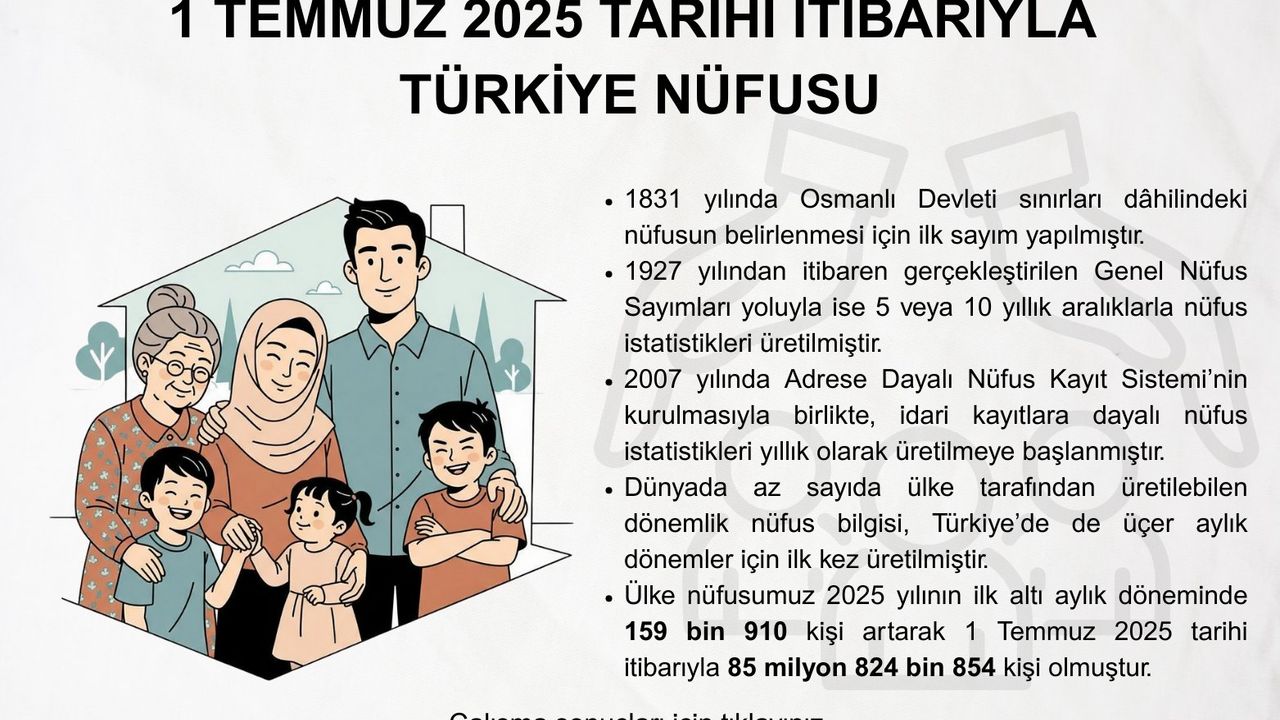 ANKARA, (DHA)- TÜRKİYE İstatistik Kurumu (TÜİK), Türkiye nüfusunun 1 Temmuz itibarıyla 85 milyon 824 bin 854 kişi olduğunu açıkladı.
