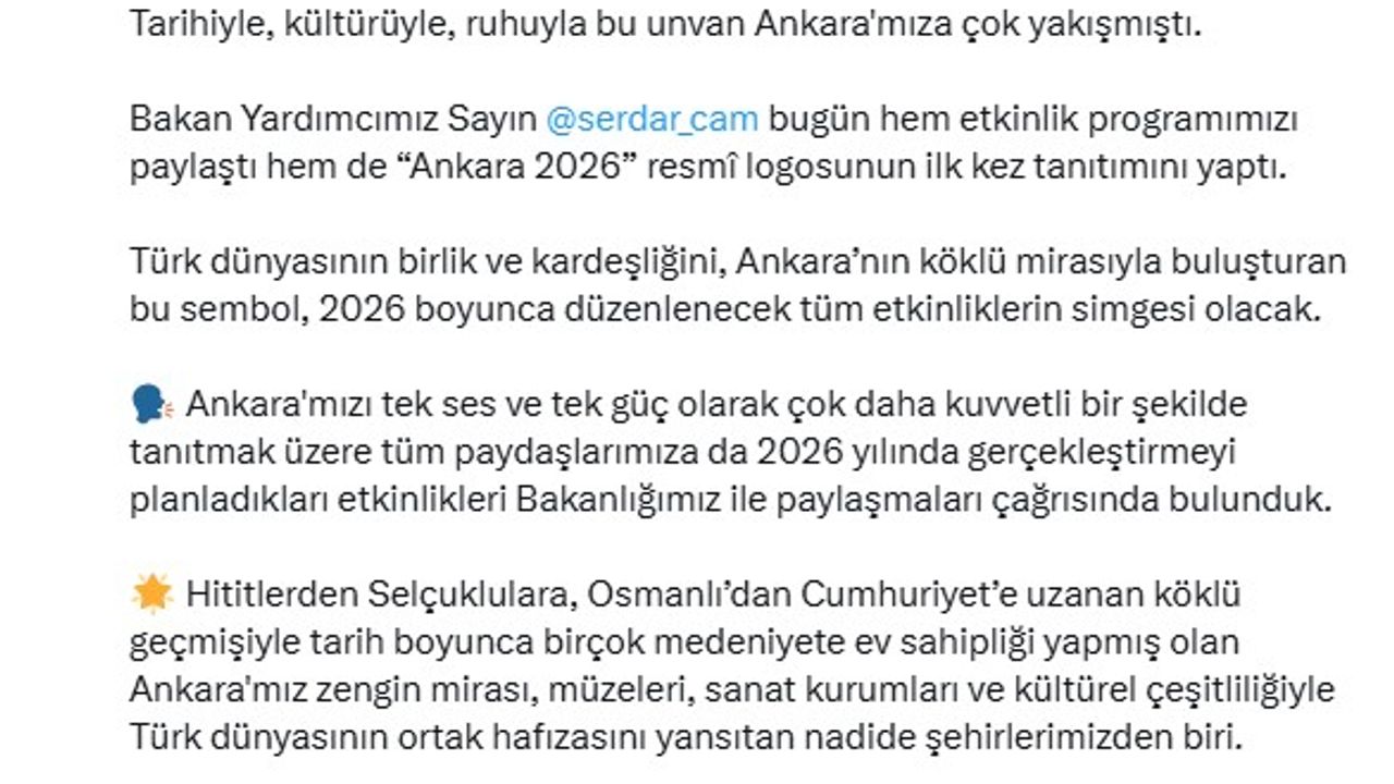 Bakan Ersoy, Nsosyal hesabından yaptığı açıklamada, "Güzel bir haberimiz var. 2026 yılı 'Türk Dünyası Turizm Başkenti' seçilen Ankara'mızın Bakanlığımız koordinasyonunda yürütülen etkinlik takvimi belli oldu. Tarihiyle, kültürüyle, ruhuyla bu ünvan Ankara'mıza çok yakışmıştı. Bakan Yardımcımız Sayın Serdar Çam bugün hem etkinlik programımızı paylaştı hem de 'Ankara 2026' resmi logosunun ilk kez tanıtımını yaptı. Türk dünyasının birlik ve kardeşliğini, Ankara'nın köklü mirasıyla buluşturan bu sembol, 2026 boyunca düzenlenecek tüm etkinliklerin simgesi olacak" dedi.