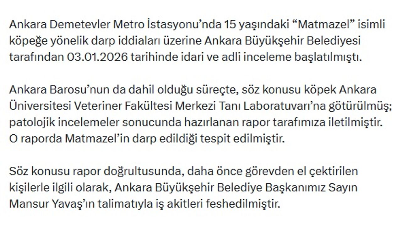 EGO Genel Müdürlüğü'nden soruşturmaya ilişkin sanal medyadan yapılan yazılı açıklamada, 'Ankara Demetevler Metro İstasyonu'nda 15 yaşındaki 'Matmazel' isimli köpeğe yönelik darp iddiaları üzerine Ankara Büyükşehir Belediyesi tarafından 03.01.2026 tarihinde idari ve adli inceleme başlatıldı. Ankara Barosu'nun da dahil olduğu süreçte, söz konusu köpek Ankara Üniversitesi Veteriner Fakültesi Merkezi Tanı Laboratuvarı'na götürülmüş; patolojik incelemeler sonucunda hazırlanan rapor tarafımıza iletilmiştir. O raporda Matmazel'in darp edildiği tespit edilmiştir. Söz konusu rapor doğrultusunda, daha önce görevden el çektirilen kişilerle ilgili olarak, Ankara Büyükşehir Belediye Başkanımız Sayın Mansur Yavaş'ın talimatıyla iş akitleri feshedilmiştir. Olayla ilgili Ankara Cumhuriyet Başsavcılığı nezdinde yürütülen adli soruşturma devam etmekte olup, Ankara Büyükşehir Belediyesi de bu dosyada müşteki/katılan olarak yer alacaktır' ifadeleri kullanıldı. (DHA)