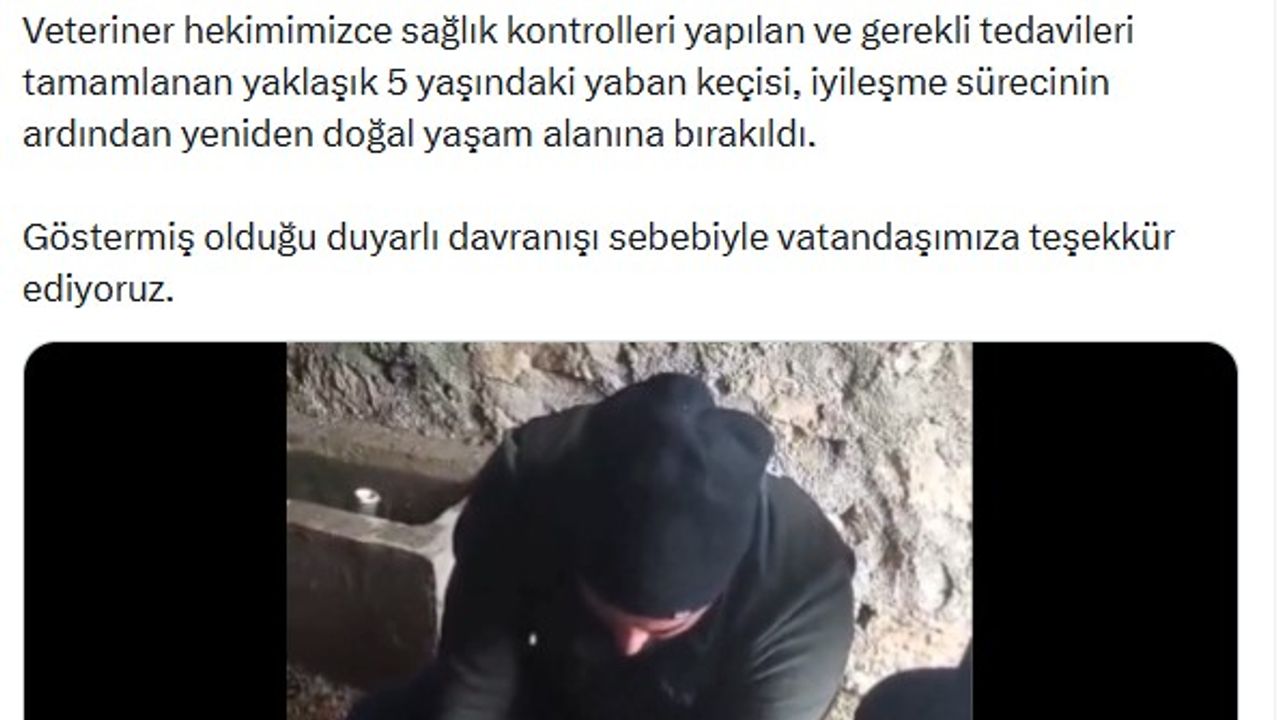 DKMP Genel Müdürü Çokçetin, sosyal medya hesabından yaptığı açıklamada, "Sivas’ın Gürün ilçesinde hayvanlarını otlatan duyarlı bir vatandaşımız tarafından bulunan yaralı yaban keçisi, ekiplerimizin hızlı müdahalesiyle tedavi altına alındı. Veteriner hekimimizce sağlık kontrolleri yapılan ve gerekli tedavileri tamamlanan yaklaşık 5 yaşındaki yaban keçisi, iyileşme sürecinin ardından yeniden doğal yaşam alanına bırakıldı. Göstermiş olduğu duyarlı davranışı sebebiyle vatandaşımıza teşekkür ediyoruz” dedi. (DHA)
