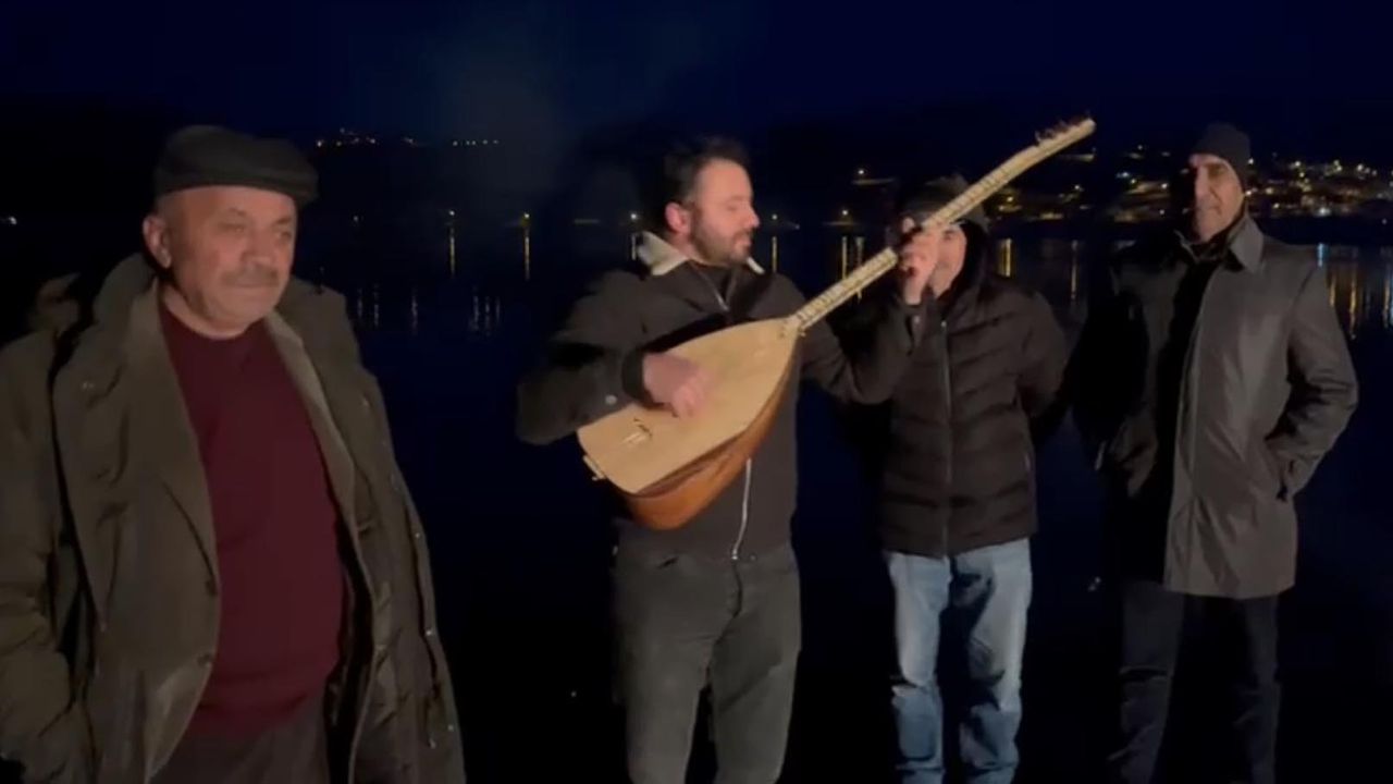 Yeni yıla dakikalar kala çektikleri kaz ziyafetinin ardından arkadaşlar yerel sanatçı Berkan Öztürk'ün türküleriyle halay çekip, eğlendi. (DHA)