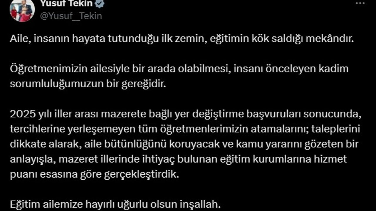 Milli Eğitim Bakanı Yusuf Tekin, sosyal medya hesabından yaptığı açıklamada, "Aile, insanın hayata tutunduğu ilk zemin, eğitimin kök saldığı mekandır. Öğretmenimizin ailesiyle bir arada olabilmesi, insanı önceleyen kadim sorumluluğumuzun bir gereğidir. 2025 yılı iller arası mazerete bağlı yer değiştirme başvuruları sonucunda, tercihlerine yerleşemeyen tüm öğretmenlerimizin atamalarını; taleplerini dikkate alarak, aile bütünlüğünü koruyacak ve kamu yararını gözeten bir anlayışla, mazeret illerinde ihtiyaç bulunan eğitim kurumlarına hizmet puanı esasına göre gerçekleştirdik. Eğitim ailemize hayırlı uğurlu olsun inşallah" dedi. (DHA)