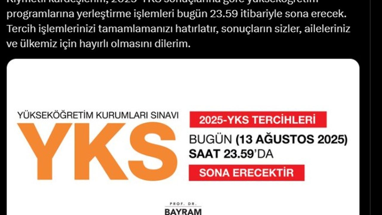 YKS sonuçlarının 19 Temmuz'da açıklanmasının ardından üniversite adayları için tercih süreci 1 Ağustos'ta başladı. Tercih işlemleri Ölçme Seçme ve Yerleştirme Merkezi'nin (ÖSYM) 'ais.osym.gov.tr' internet adresinden yapılıyor. Adayların tercihlerini, 2025-YKS Yükseköğretim Programları ve Kontenjanları Kılavuzu doğrultusunda yapması gerekiyor. ÖSYM Başkanı Bayram Ali Ersoy, üniversite tercihlerinin son günü dolayısıyla sosyal medya hesabından paylaşım yaptı. Ersoy, "Kıymetli kardeşlerim, 2025-YKS sonuçlarına göre yükseköğretim programlarına yerleştirme işlemleri bugün 23.59 itibariyle sona erecek. Tercih işlemlerinizi tamamlamanızı hatırlatır, sonuçların sizler, aileleriniz ve ülkemiz için hayırlı olmasını dilerim" dedi. (DHA)