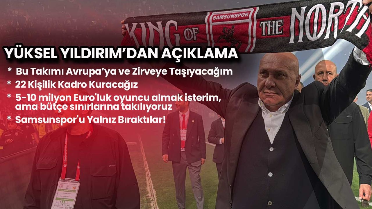 Samsunspor Başkanı Yüksel Yıldırım, sezonun tamamlanmasının ardından takımın geleceğiyle ilgili dikkat çeken açıklamalarda bulundu. 1 Haziran itibariyle transfer çalışmalarına başladıklarını belirten Yıldırım, "Ay sonu sezonu açıyoruz, transferlerin çoğunu erkenden tamamlamalıyız" dedi.