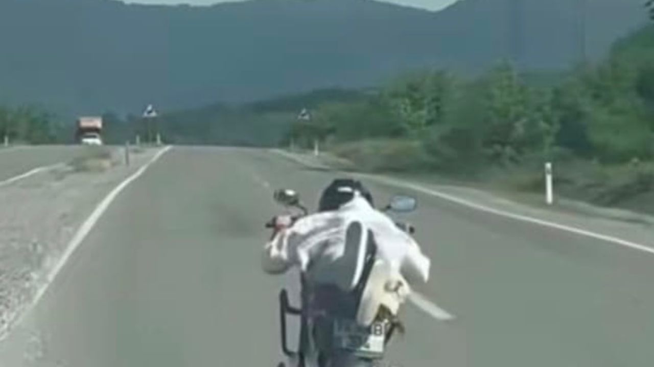 Bartın-Karabük kara yolunun Muratbey köyü mevkisinde dün B.K.'nin motosikletin üzerine yüzüstü uzanarak ilerlediği, kendisini ve trafiği tehlikeye düşürdüğü anlar, cep telefonu kamerasıyla görüntülendi. Görüntülerin sosyal medyada paylaşılması üzerine harekete geçen jandarma trafik ekipleri, B.K.'yi evinde yakaladı. Ekipler, motosikleti trafikten menederken, sürücü B.K.'ye 'trafik güvenliğini tehlikeye düşürme' suçundan 45 bin 841 TL idari para cezası uyguladı. (DHA)