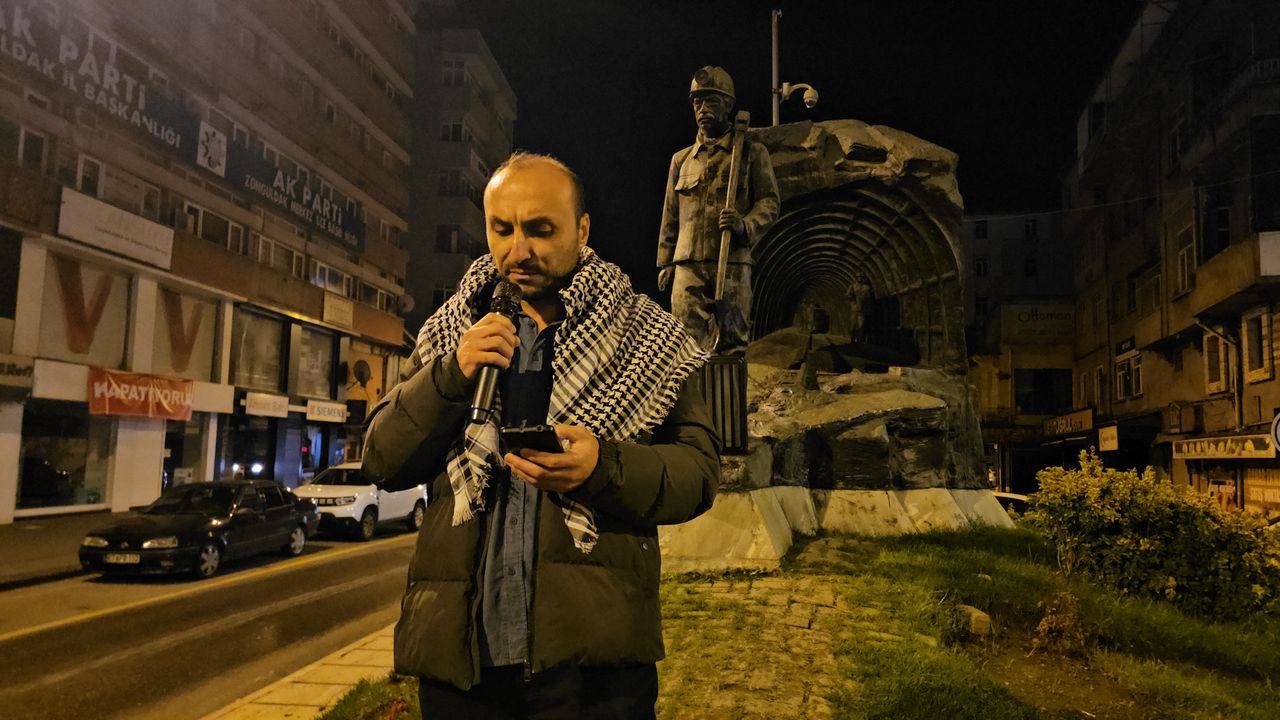 Kentte gece saatlerinde vatandaşlar, sivil toplum kuruluşlarının çağrısıyla Madenci Anıtı’nda buluştu. Vatandaşlar, Gazze’ye insani yardım götüren ve sivillerden oluşan Sumud Filosu’na yönelik İsrail’in müdahalesinin ardından, tepki göstermek için eylem yaptı. Grup, İsrail aleyhine sloganlar attı. Grup adına açıklama yapan Hamza Girgin, İsrail’in Sumud Filosu’na uluslararası sularda barbarca saldırdığını söyleyerek, “Sivil gemilere müdahale edildi. Yardım taşıyan gönüller hedef alındı. Bu sadece bir saldırı değil, hukukun, vicdanın ve insanlık onurunun açıkça çiğnenmesidir. İsrail’in sicili bellidir. On yıllardır Filistin halkını abluka altında tutan, şehirleri yıkan, sivilleri hedef alan, çocukları katleden bu işgal rejimi; bugün bir kez daha vahşiliğini sergilemektedir. Gazze’de yıllardır süren abluka ve 2 yılı aşan soykırım, şimdi de denizlerdeki sivil yardım gemilerine yönelen saldırıyla devam ediyor. Artık yeter. İsrail ancak güçten anlar, kınama ve diplomatik suskunluk onu durdurmaz. Sözlerinizle değil, iradenizle, cesaretinizle sınanıyorsunuz” dedi. (DHA)